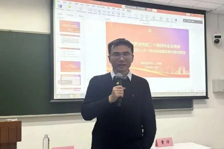 书院党委书记王秀梅以“深入学习贯彻党的二十届四中全会精神 充分认识教育科技人才一体化的战略布局与使命担当”为题讲授党课,传达了学校教育科技人才交流工作的相关会议精神,强调学习贯彻党的二十届四中全会精神是当前及今后一个时期的重大政治任务。王秀梅老师讲到,党的二十大首次将教育、科技、人才“三位一体”统筹部署,三者分别是中国式现代化的基础、关键与根本,在全球科技革命与产业变革加速演进的背景下,需推动高水平科技自立自强与人才自主培养深度融合,实现三者协同发展。